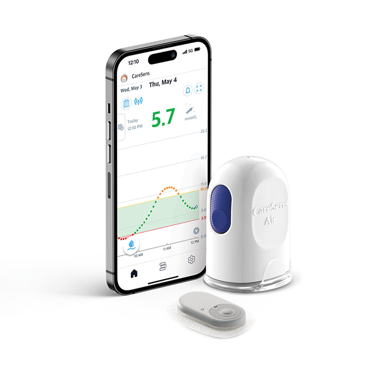 The CareSens Air continuous glucose monitoring system (CGMS) is indicated for the management of diabetes mellitus via the measurement of glucose in the interstitial fluid in people aged 18 years and over. CareSens Air is a class IIb medical device. If current sensor readings do not match symptoms or expectations, use a glucose meter to make diabetes treatment decisions. Talk to your healthcare professional to see if this product is right for you.