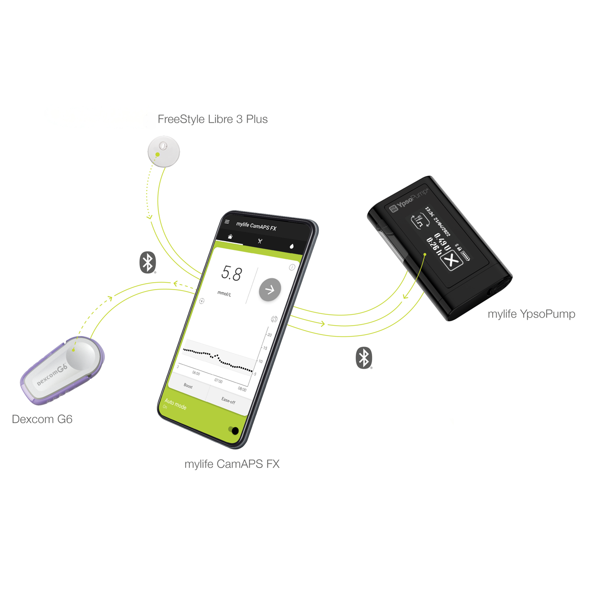 myLife Loop: For automated insulin delivery with the mylife YpsoPump, you need the mylife CamAPS FX app and the Dexcom G6 or FreeStyle Libre 3 Plus CGM. Connect the mylife CamAPS FX app to the insulin pump and sensor.