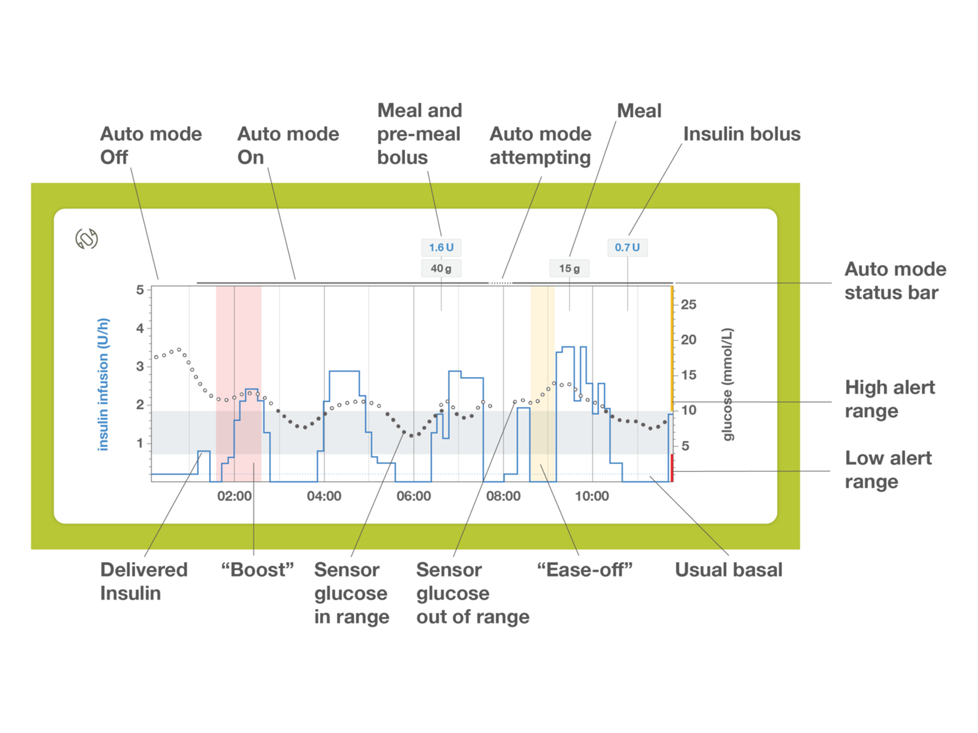 Continually adjusting insulin delivery every 8-12 minutes based on CGM glucose data received every minute (FreeStyle Libre 3 Plus) or every 5 minutes (Dexcom G6). Learning from previous insulin delivery and meal bolus information to adapt to diurnal, day-to-day as well as post-meal insulin needs.